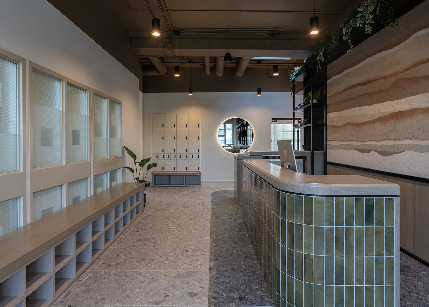 The reception desk acts as an anchor for the entire studio. Designed as a gathering space, it promotes moments of connection before and after class.