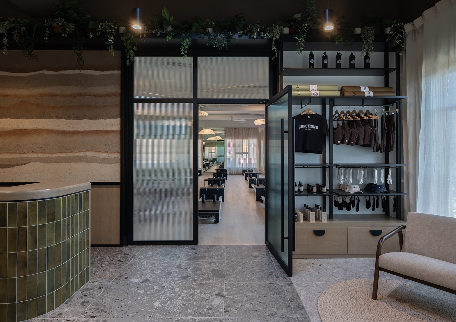 At Junction 9, the Mission studio was designed to balance movement, mindfulness, and community. The space feels calm and inclusive, with a welcoming reception that serves as a natural gathering point and sets the tone upon arrival. Soft, natural materials, gentle curves, and abundant daylight create an environment that feels open yet grounded, while the organized Pilates studio supports focus and ease of movement. Together, these elements shape a space that encourages connection, clarity, and a sense of belonging—both during practice and beyond.