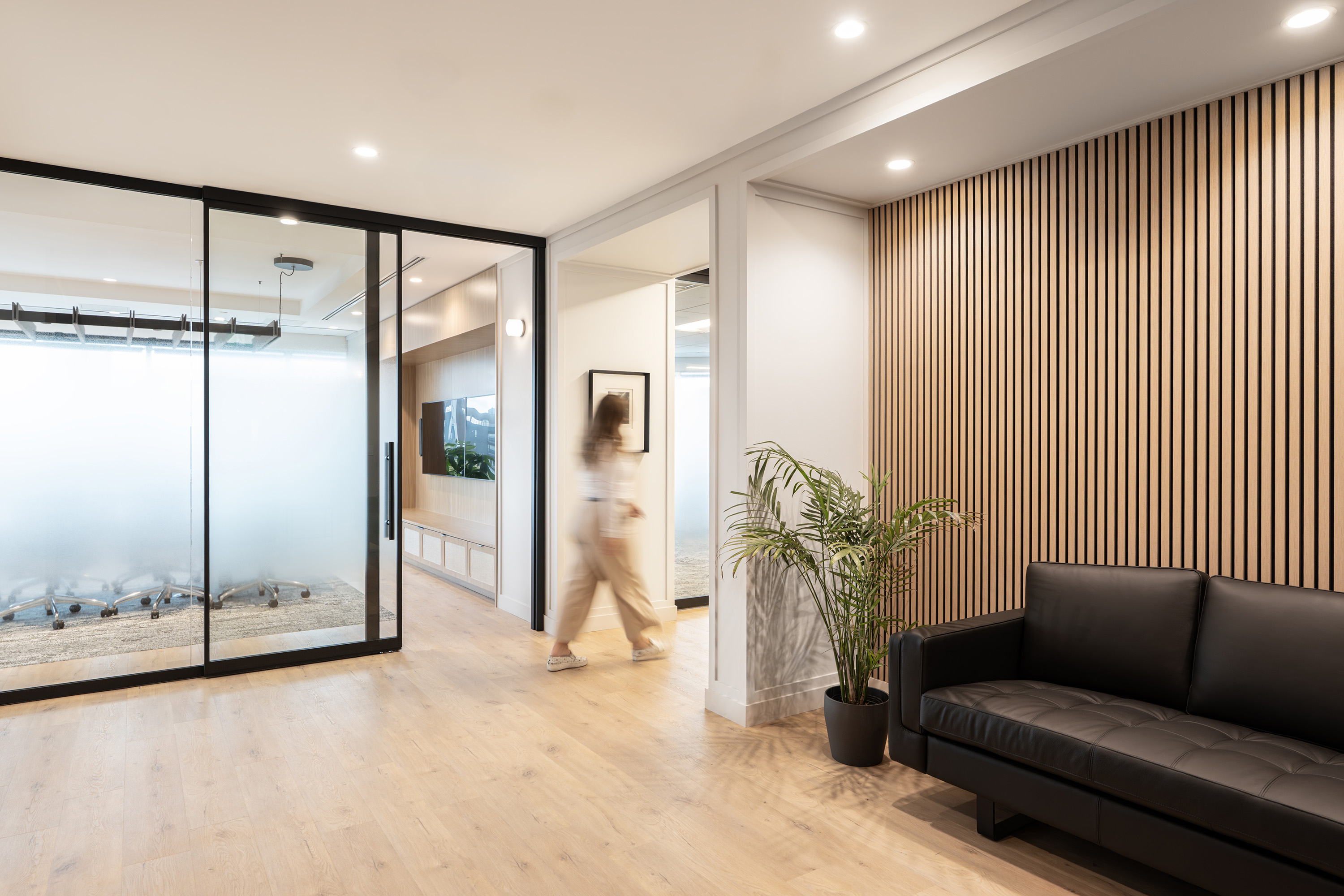 An operable wall between these two adjacent spaces allows them to function independently day-to-day, then open up into a single large-format room for company gatherings, presentations, or hosted events. It's flexibility built into the architecture, not bolted on as an afterthought.