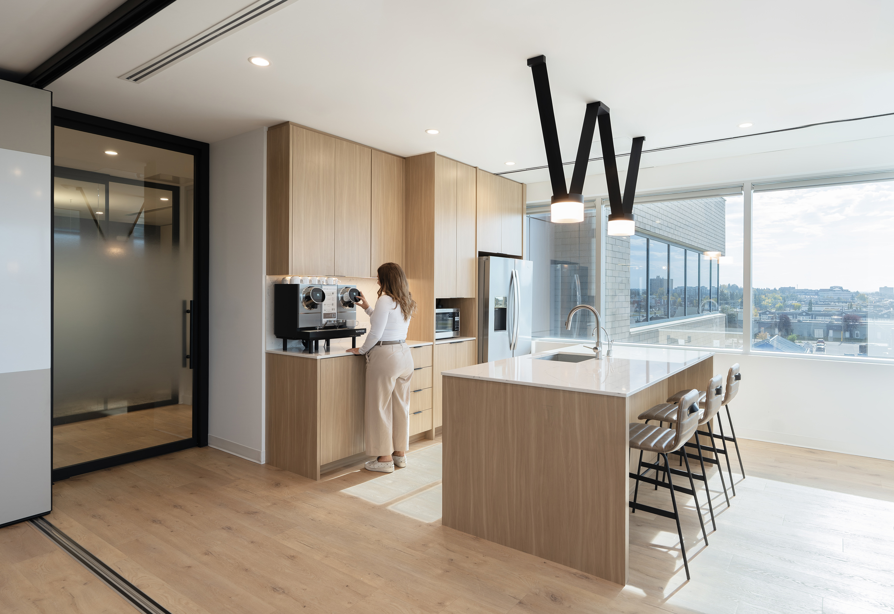 Positioned with glazing on two sides, the kitchen sits at theintersection of light and community. Every team member has access to naturalviews and shared daylight, reinforcing a sense of openness and equality acrossthe floor.